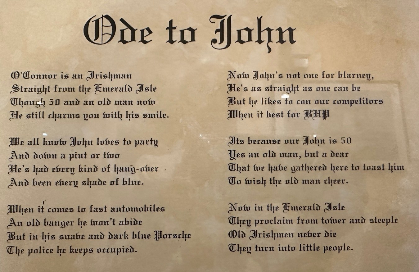 When I retired in March 2009, aged 63, after working for 41 years in the oil industry John threw a number of parties for me, and so my leaving was much more memorable than the sober environment I experienced on my first days.